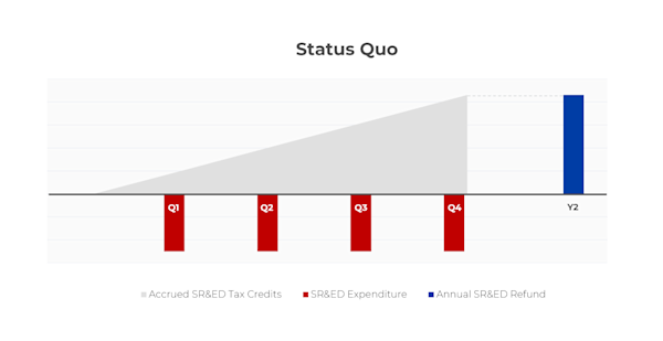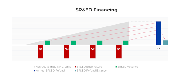 While incredibly valuable, the program only disburses refunds annually, which isn't conducive to the cash flow needs of growing companies. Luckily, there's a strategic tool they can use to access the value in their earned credits at any point throughout the year > SR&ED financing.